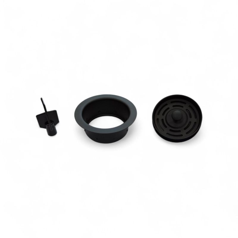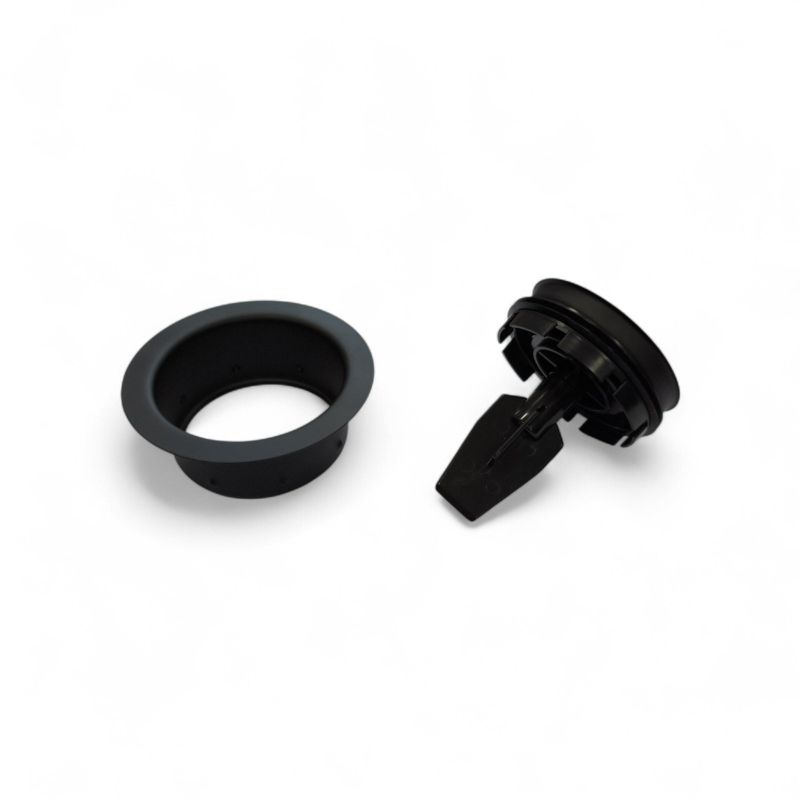 Черният кръгъл фланец с тапа е практичен аксесоар за кухненски мивки, оборудвани с мелница за хранителни отпадъци (диспоузер). Той се монтира в отвора на мивката и осигурява стабилна връзка между мивката и диспоузера, като същевременно позволява затваряне на отвора чрез включената тапа.